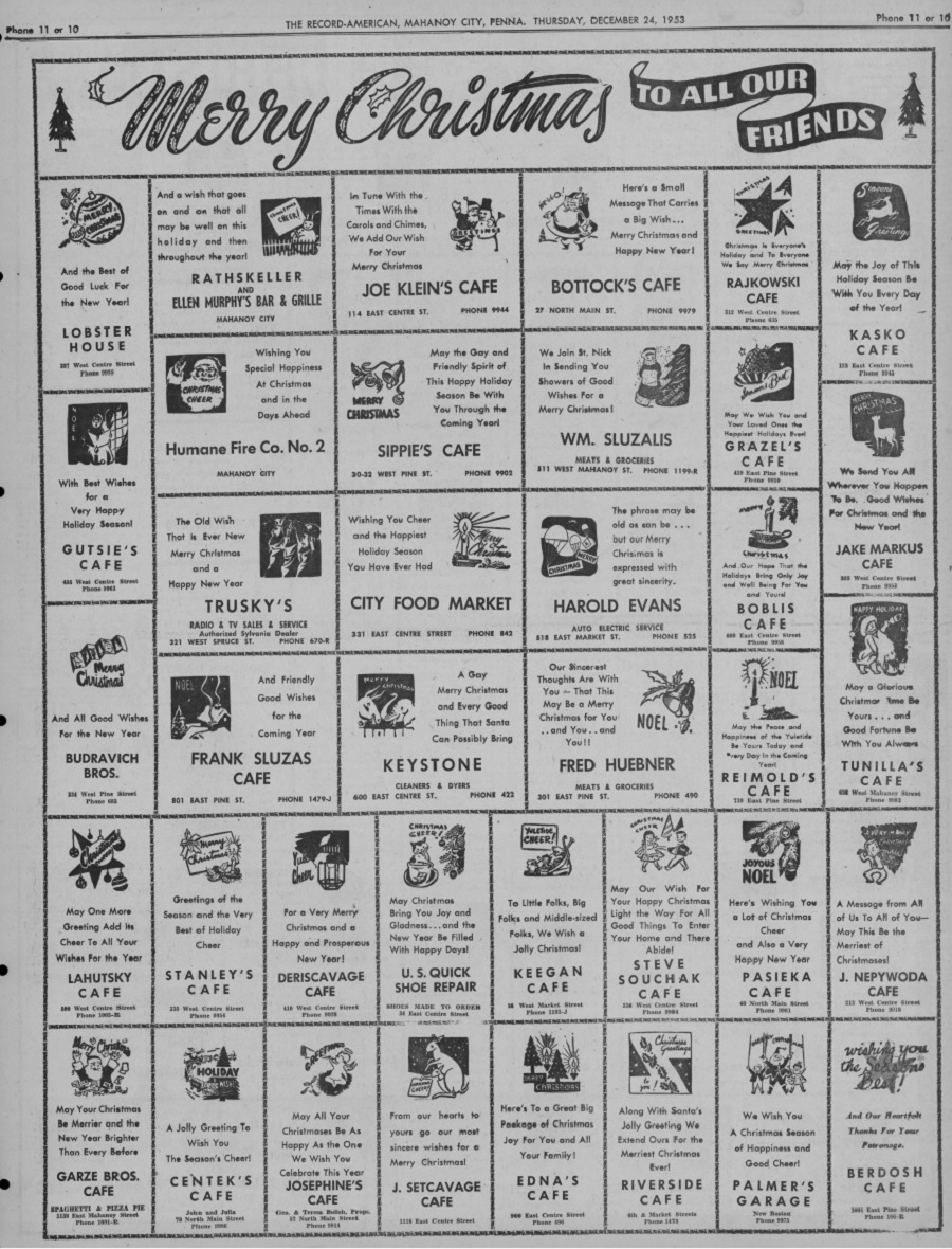 This shot of the 1955 Community Tree is courtesy of the Souchak family. Larry Souchak Sr. was a long time member of the Mahanoy City Social Club. The view above is looking north toward Railroad Street. All the other tree photos are shot from the west looking east.