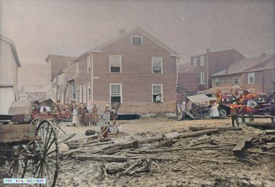 For full fifteen minutes the flood seemed to gain in volume, the black waters covering the streets, and finding their way into basements, and every nook and cranny. Then the waters began to rapidly subside, and in their place remained a covering of slime and mud in some places several inches deep, and all the indescribable debris and riff-raft of the flood.